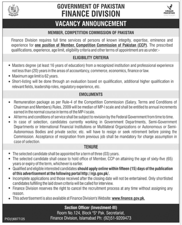 Finance Division Jobs 2026 – Apply for Member Competition Commission of Pakistan