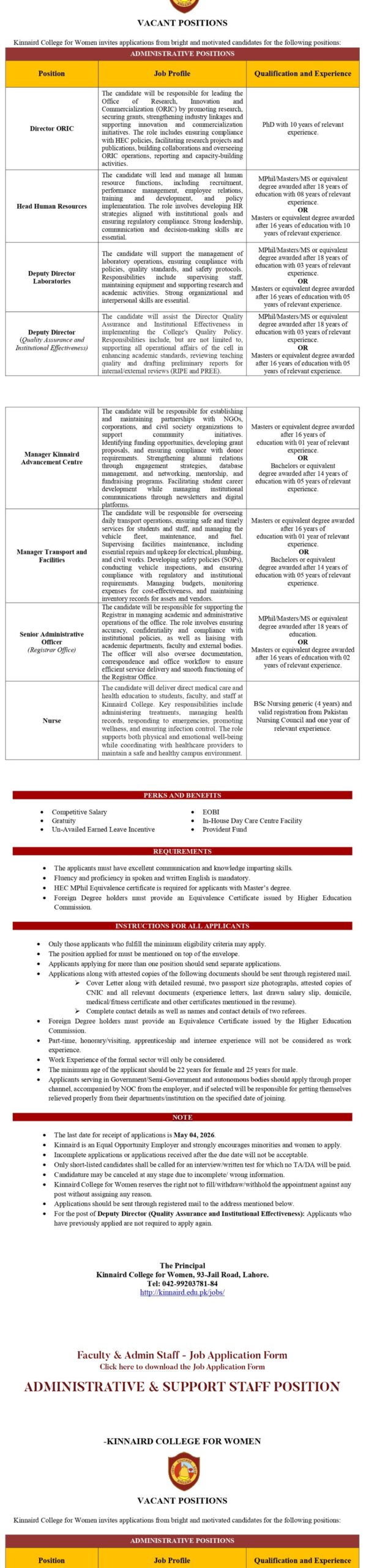 Kinnaird College is offering a wide range of administrative vacancies. Each position requires a specific set of qualifications, experience, and professional skills.