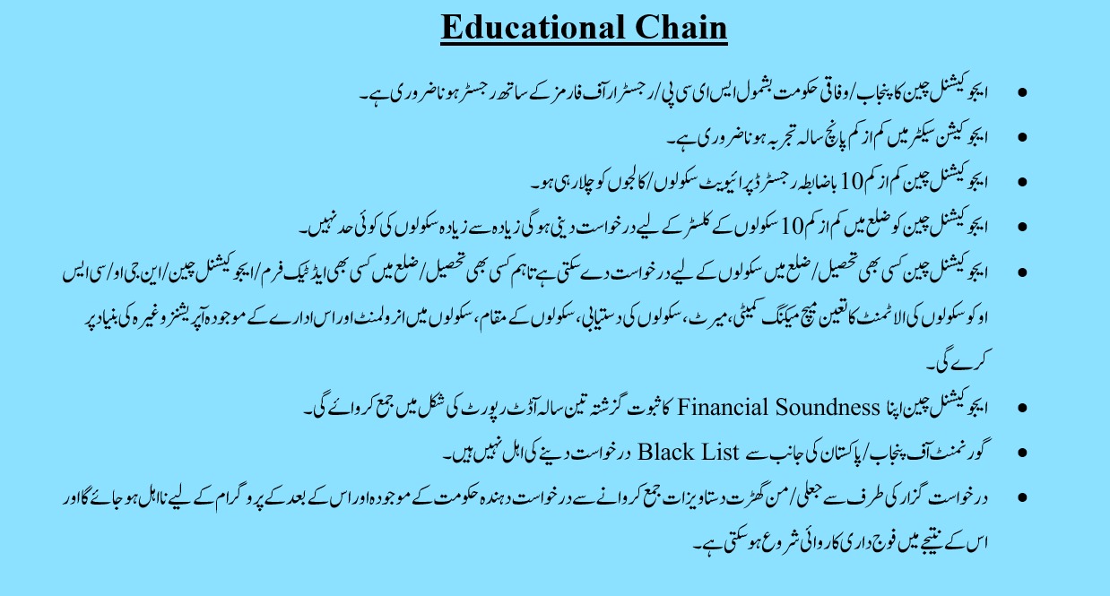 Educational Chains: Must operate at least 10 formal schools or colleges.