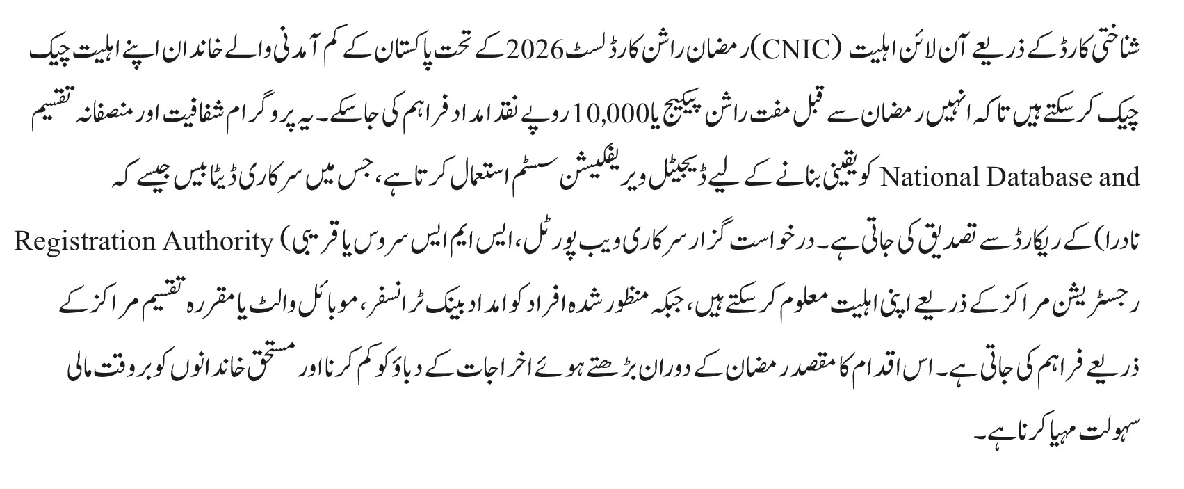 Due to rising food prices, this Ramadan relief package is designed to reduce financial pressure on deserving households. The online verification system makes it possible to check eligibility within minutes.