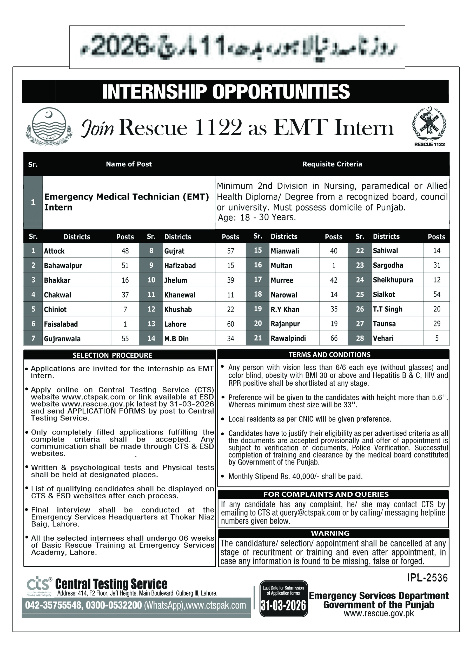 If you have any questions regarding the Rescue 1122 EMT Internship 2026, you can contact: