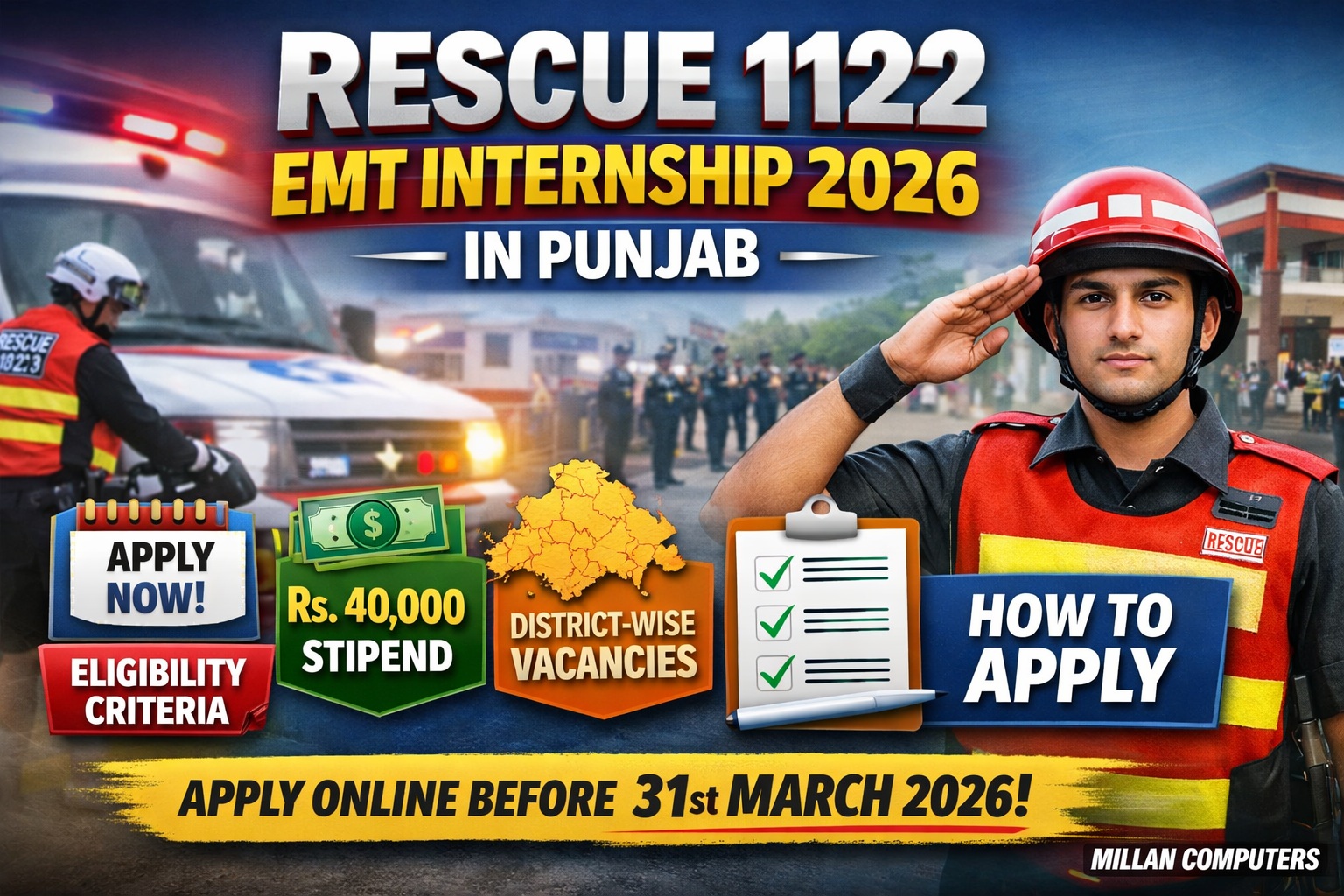 If you are looking for a career opportunity in emergency services, the Rescue 1122 EMT Internship 2026 is one of the best options available in Punjab. This internship program provides a golden chance for candidates with medical or paramedical backgrounds to gain practical experience in life-saving operations. Offered by the Emergency Services Department, Government of Punjab, this internship not only enhances your skills but also prepares you for future professional roles in emergency response services.