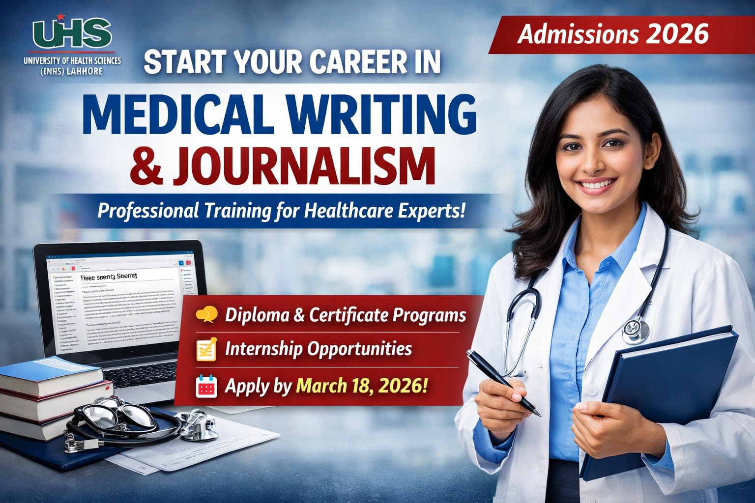 To improve the quality of medical journals in Pakistan, University of Health Sciences (UHS) Lahore has announced admissions for its Medical Writing and Journalism Programs 2026.